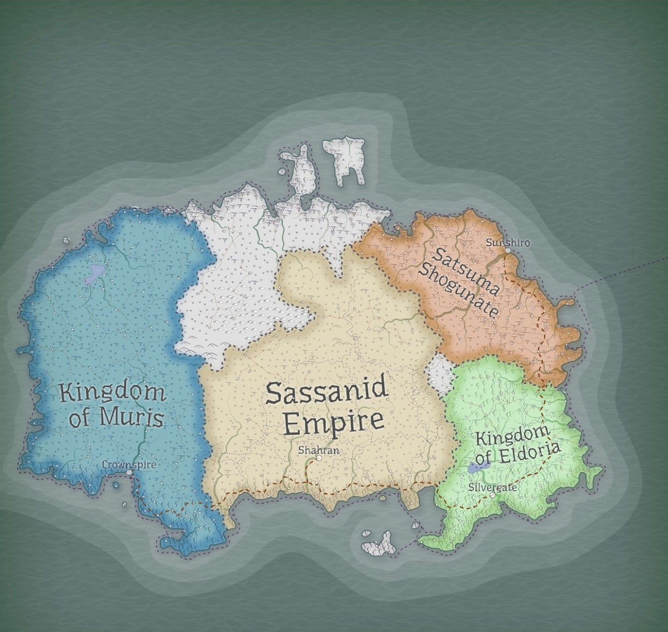 The four kingdoms have an uneasy coexistence. While open war is rare, there are constant rivalries regarding politics, trade, and alliances. Beyond the settled borders are wilderness areas and ancient ruins.